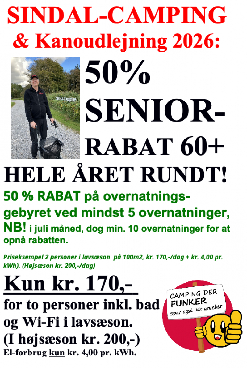 Senior 60+ og pensionist rabat på 50% af overnatningsgebyret ved min. 5 dage hele året rundt - bortset fra juli hvor det kræves minimum 10 dages ophold.