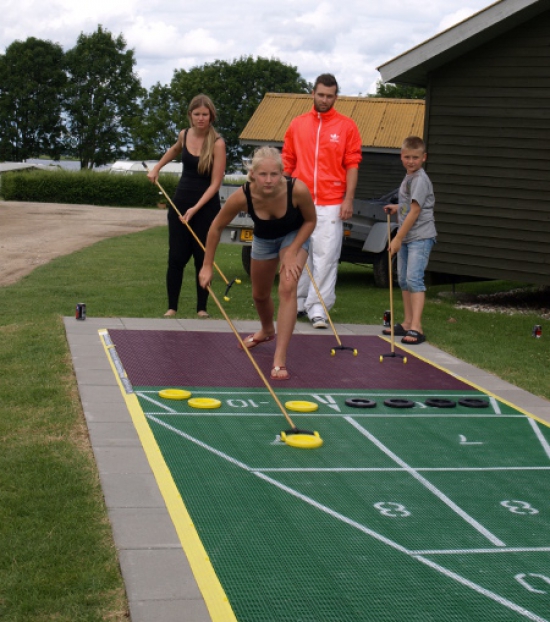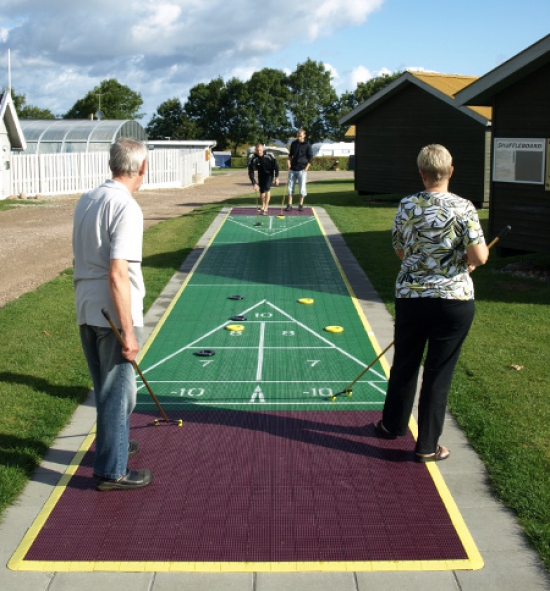 Ole Dziegiel, som er lejrchef på Holbæk Fjord Camping, tog beslutningen om at anlægge en shuffleboardbane i stedet for en petanquebane. Og det har han ikke fortrudt, for spillet er blevet ganske populært blandt campinggæsterne.